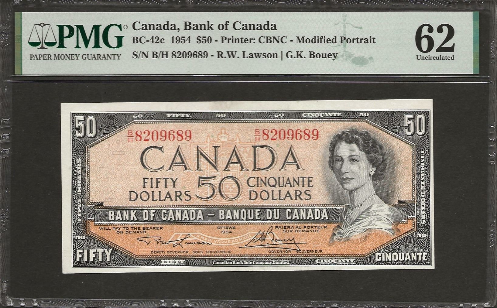 Canada BC-42c 1954 $50 UNC62 PMG. An attractive high grade example with a small right and bottom margin holding it from receiving a higher grade.