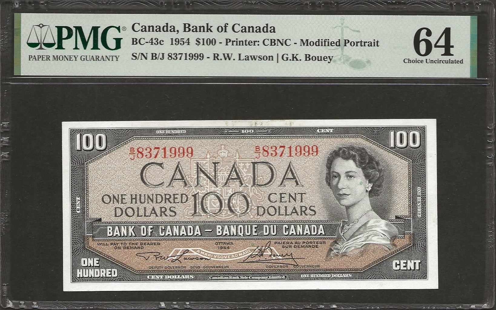 Canada BC-43c 1954 $100 CHUNC64 PMG. Wide margins and deep inks surround thie almost GEM example.
